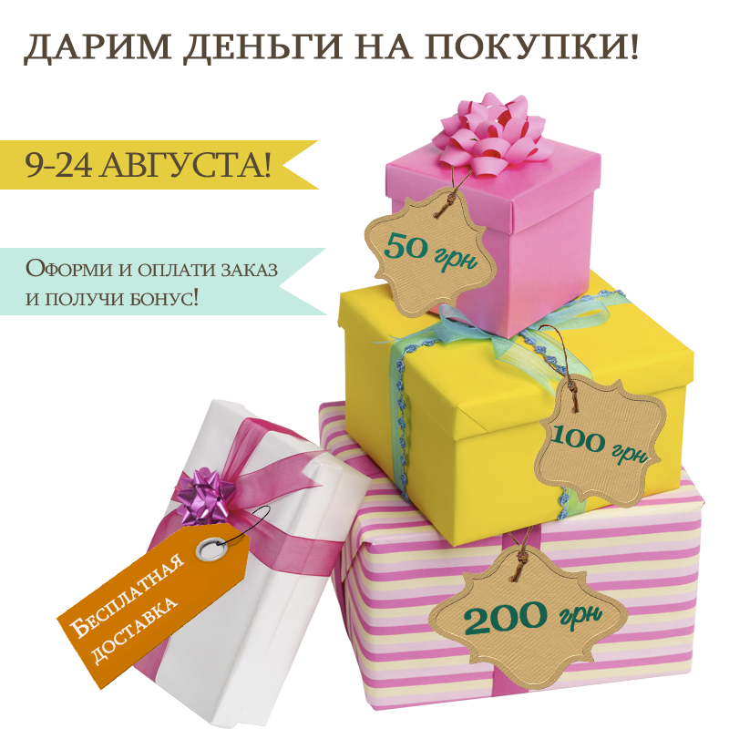 С 9 по 24 августа 2014г. оформи и оплати заказ на сумму от 500 грн и гарантированно получи от 50 грн на следующую покупку! |